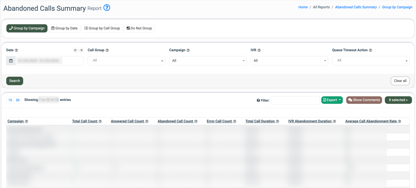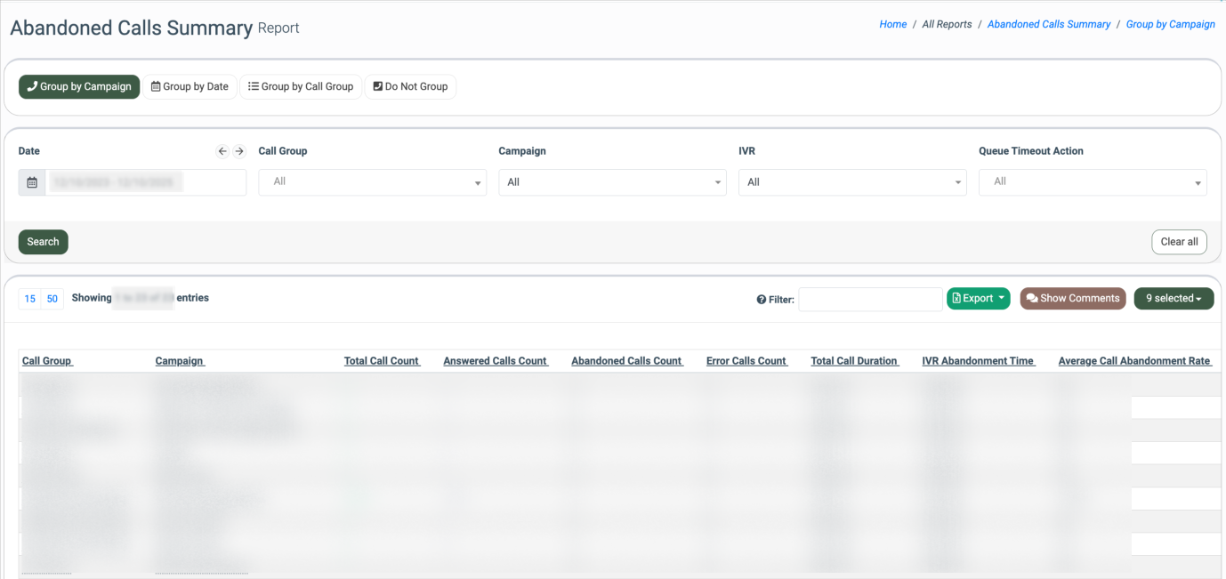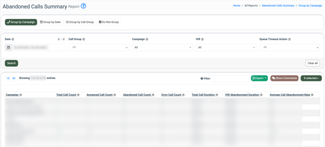 The Abandoned Calls Summary Report provides a high-level view of abandoned call activity across campaigns, call groups, IVRs, and time periods. It is designed to help contact center administrators monitor dialing performance, improve customer experience, and demonstrate compliance with regulatory requirements.