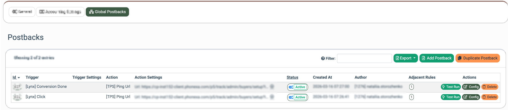 - Trigger Settings: The combination of the general postback trigger settings for which the conversions are tracked.