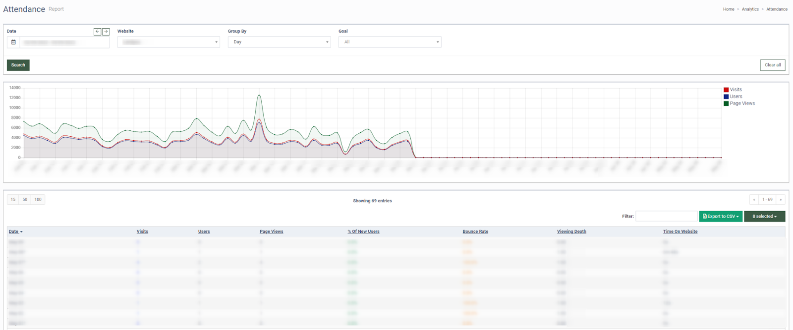 The “Attendance” report allows you to compare website traffic statistics from different periods (Day, Week, Month).