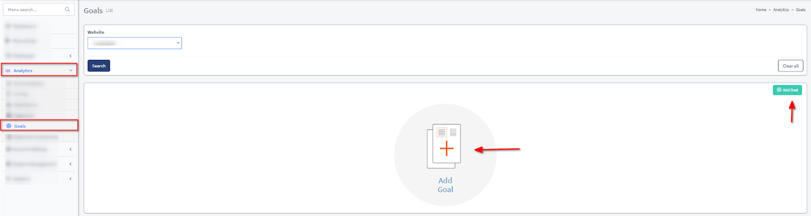 Note: To set up a goal, go to Analytics > Goals, select a website from the list, and click on the Add Goal button at the center or the green button in the upper right corner of the segment.