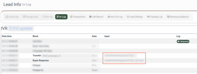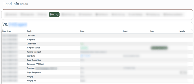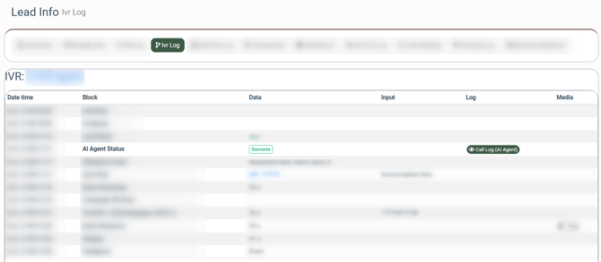 - Log: The log details related to the lead's journey through the IVR system.