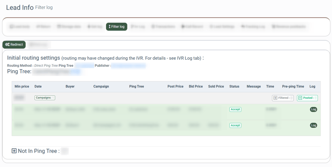 The “Filter log” tab provides a report on how the lead was processed via the Ping Tree. Depending on the Campaigns that the lead passed through, this tab can consist of several subtabs: Main Processing, Smart Tree, Redirect, Silent Processing (for Campaigns with the “Silent” type), Exit Page, and Exit Offer.