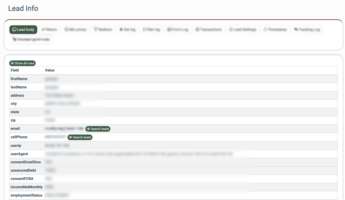 The “Lead Body” tab allows you to view all the parameters passed within the lead’s body. You can view all available parameters within the Product by clicking the "Show all rows" button.