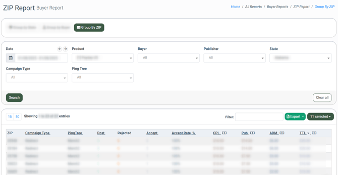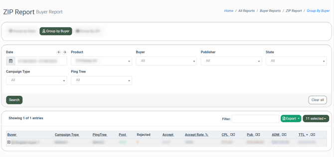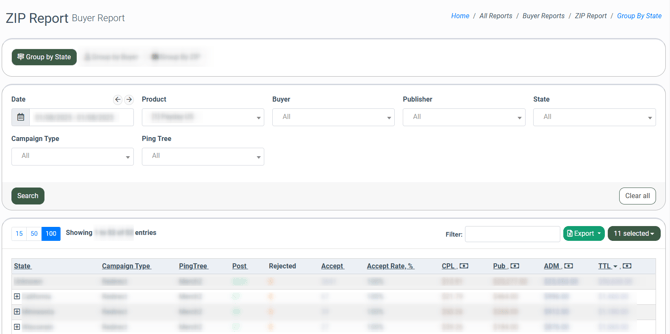 The Buyer ZIP report allows you to gather statistical information about the number of processed and sold leads, based on the campaign types and corresponding PingTrees, along with earnings of the Publisher, Admin, and the system, with the breakdown by states and corresponding ZIP codes.