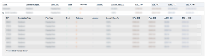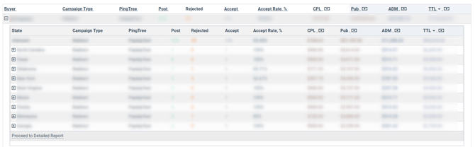 To view full information about lead processing for the selected Buyer grouped by particular states, click the “Proceed to Detailed Report” link in the ongoing collapsible section. You will be redirected to the “Group by State” tab with the particular Buyer selected in the “Buyer” filter field.