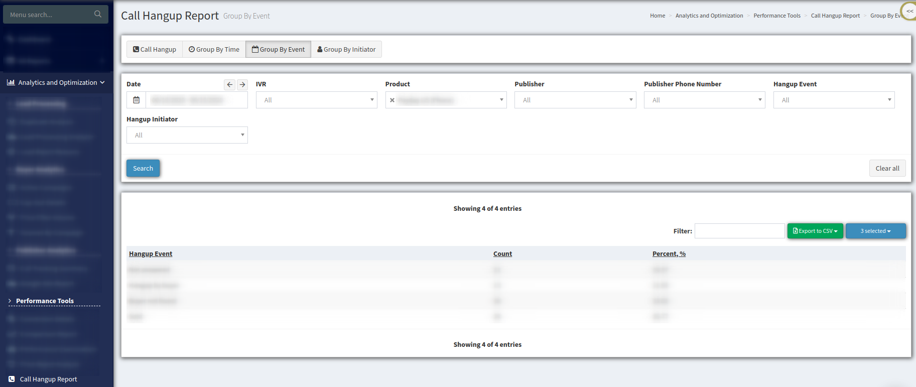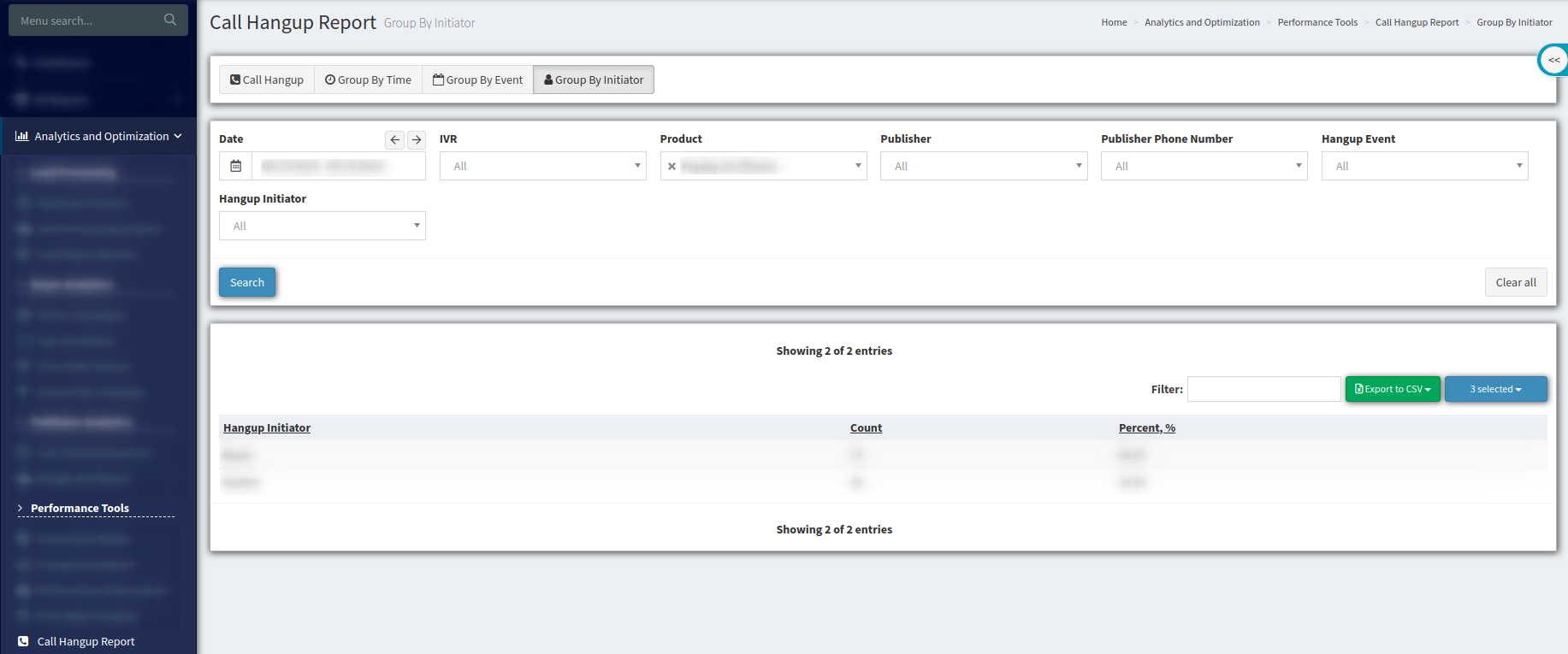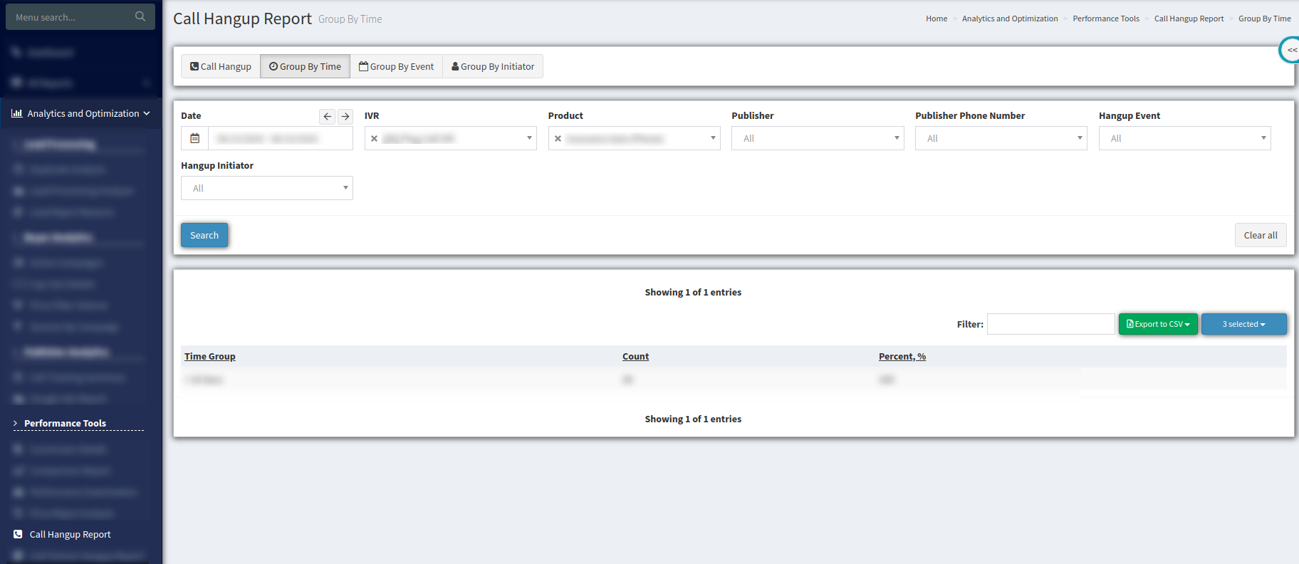 To view the “Call Hangup Report” go to the Analytics and Optimization > Performance Tools > Call Hangup Report section.