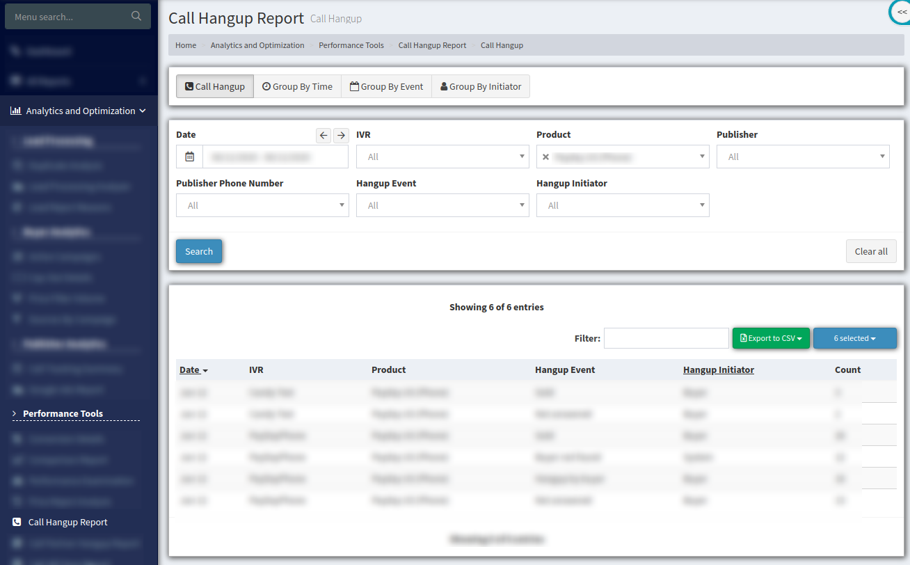 The “Call Hangup Report” allows you to view the hangup records for the publisher’s IVR. You can also view the report grouped by Time, by Event, and by Initiator.