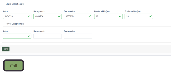 The “Static UI (optional)” block contains general settings for the button appearance, such as Color, Background, Border color, Border width (px), and Border radius (px).