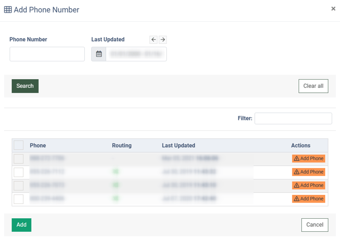 To assign a new phone number to the tracking pool, click the “Add Phone Number” button. In the pop-up window, select one of the available reserved phone numbers and click the “Add Phone” button. To narrow down the list of available numbers, use the “Phone Number” and “Last Updated” filters. Read how to assign the Phone Number to a Publisher in this Knowledge Base article.