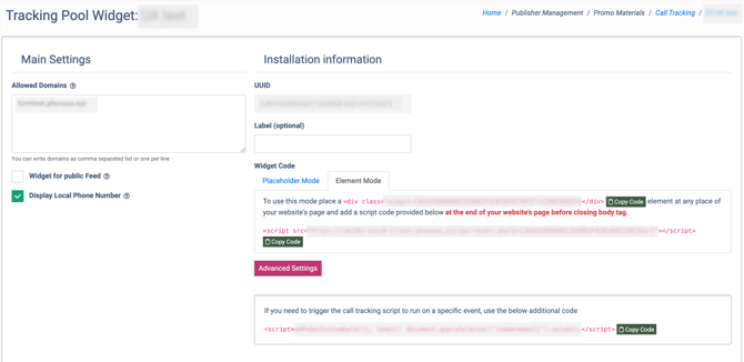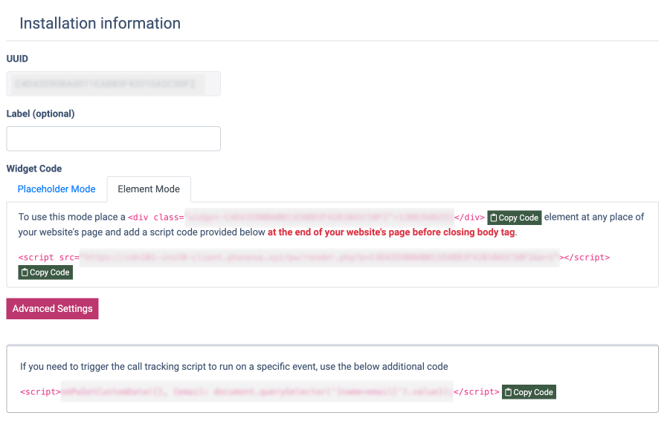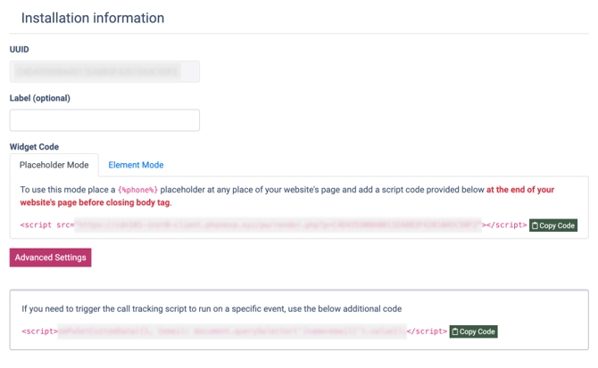 To view the code for triggering the call tracking script to run on the specific event, click the “Advanced Settings” button. To copy the code for further placement on your webpage, click the “Copy Code” button.