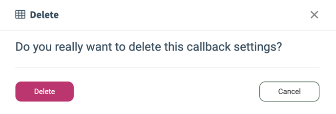 To delete an existing Callback, click the “Delete” button in the “Actions” column. Confirm the deletion by clicking the “Delete” button in the pop-up window below.