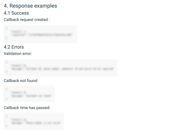 - Response examples: The examples of the responses that can be obtained after sending the API request for a successful request ("Success") and various error scenarios ("Errors").