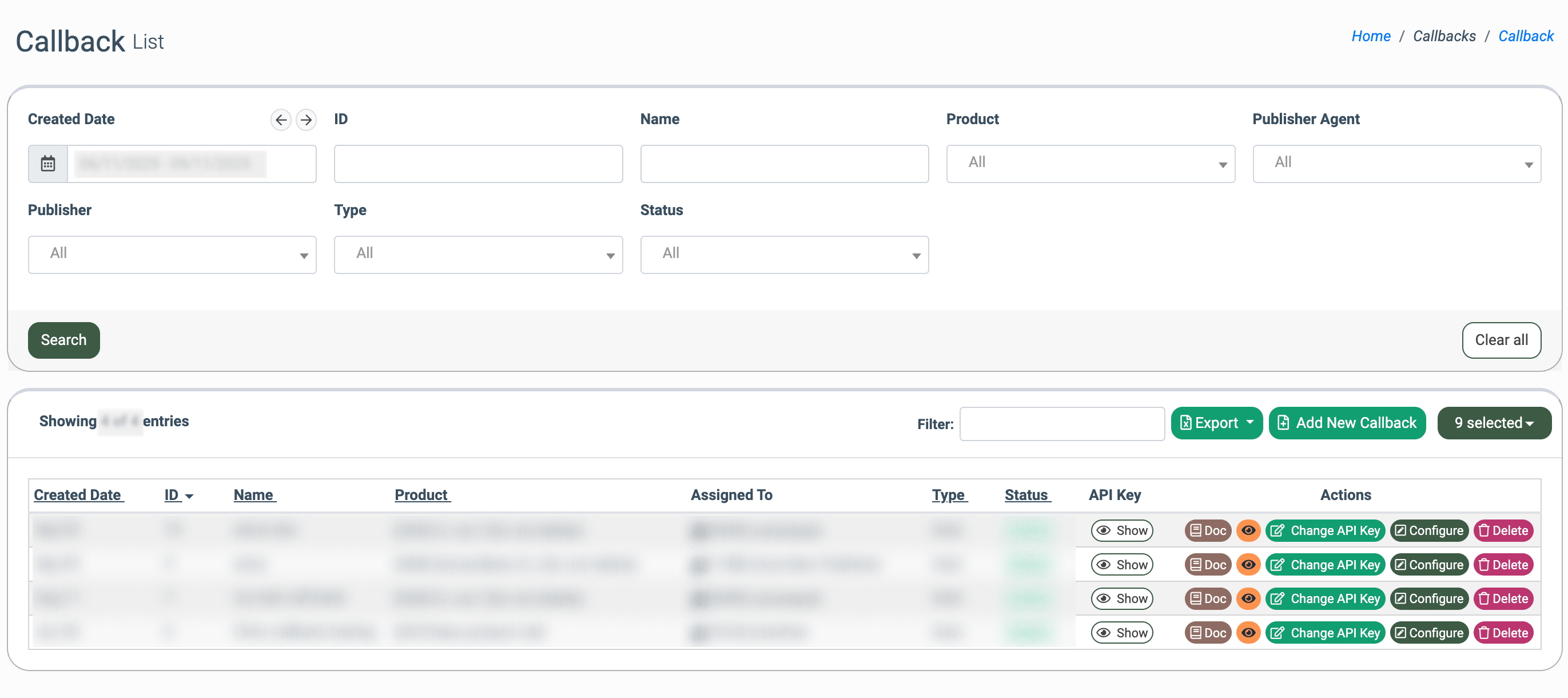 To configure the settings of a particular Callback, click the “Configure” button in the “Actions” column.