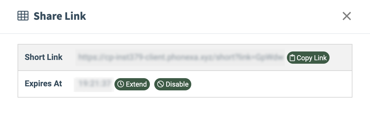 After the share link generation, the following information will be displayed in the “Share Link” pop-up window: