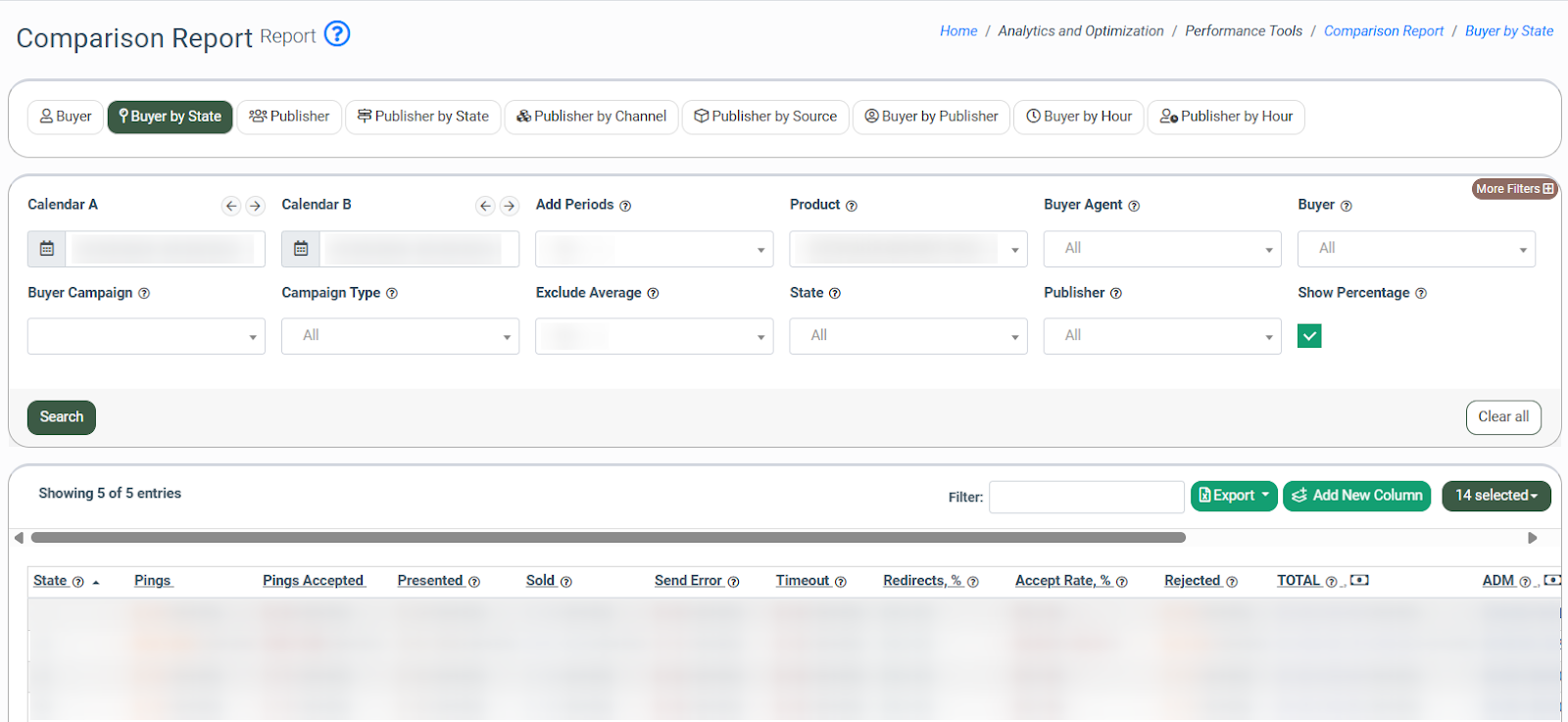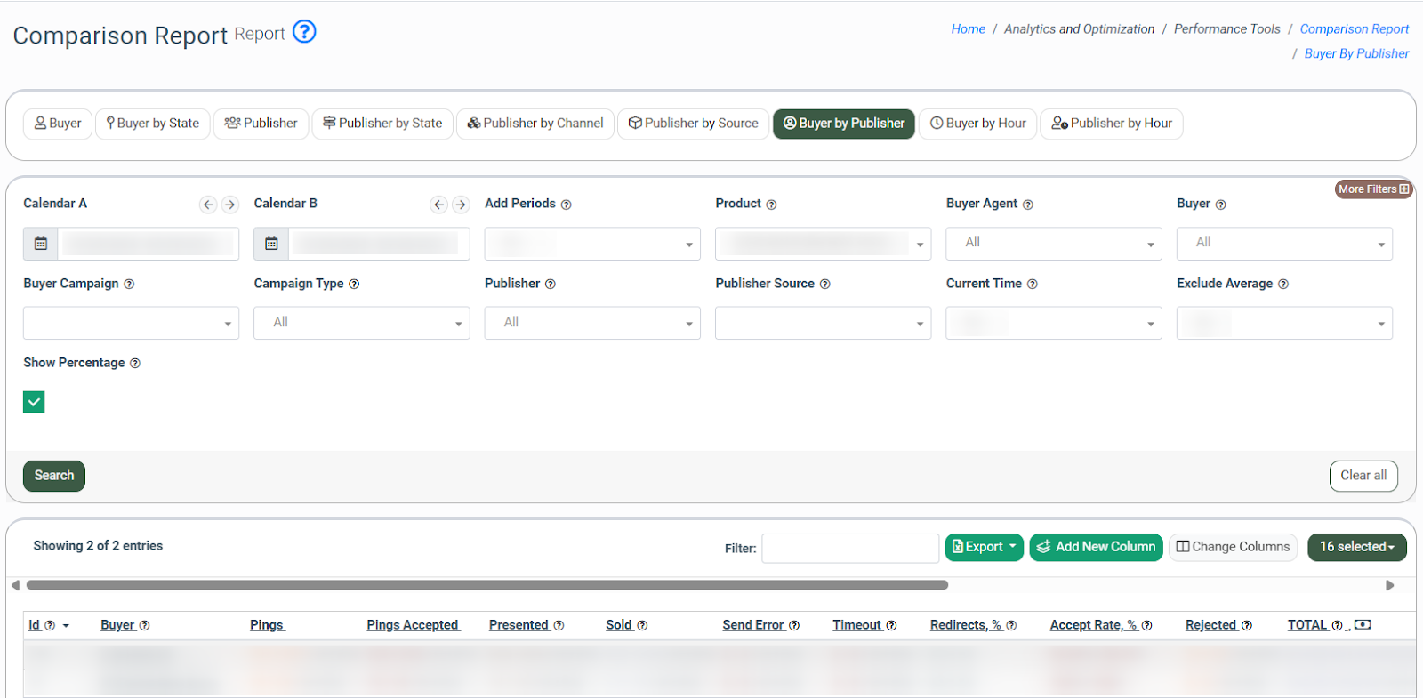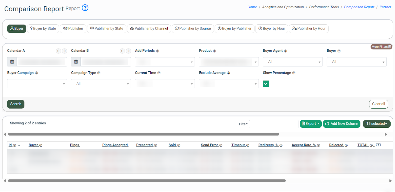 You can generate data by Buyer, Buyer by State, Publisher, Publisher by State, Publisher by Channel, Buyer by Publisher, Buyer by Hour, and Publisher by Hour for comparison.