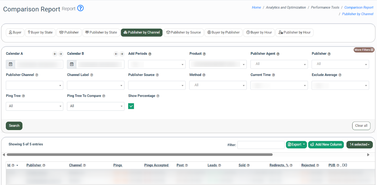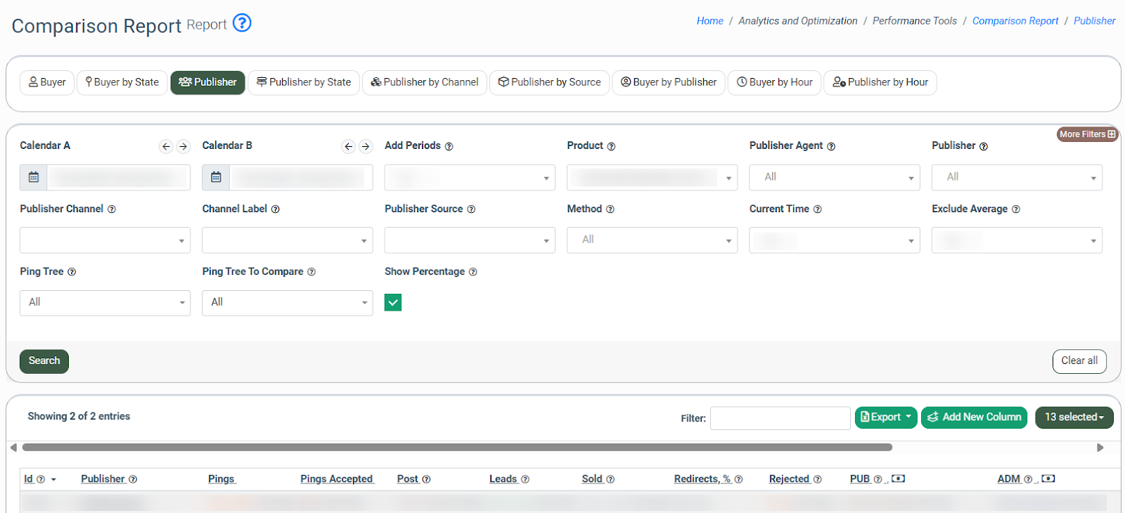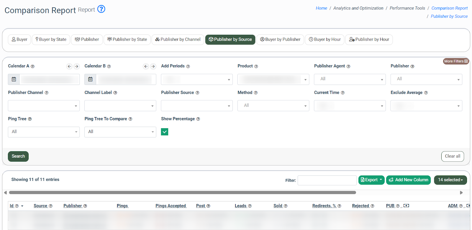 - Leads to Compare: The comparison of the number of leads for the selected periods based on the ping trees chosen through the “Ping Tree To Compare” filter. Note: This column is only active if a selection is made using the “Ping Tree To Compare” filter.