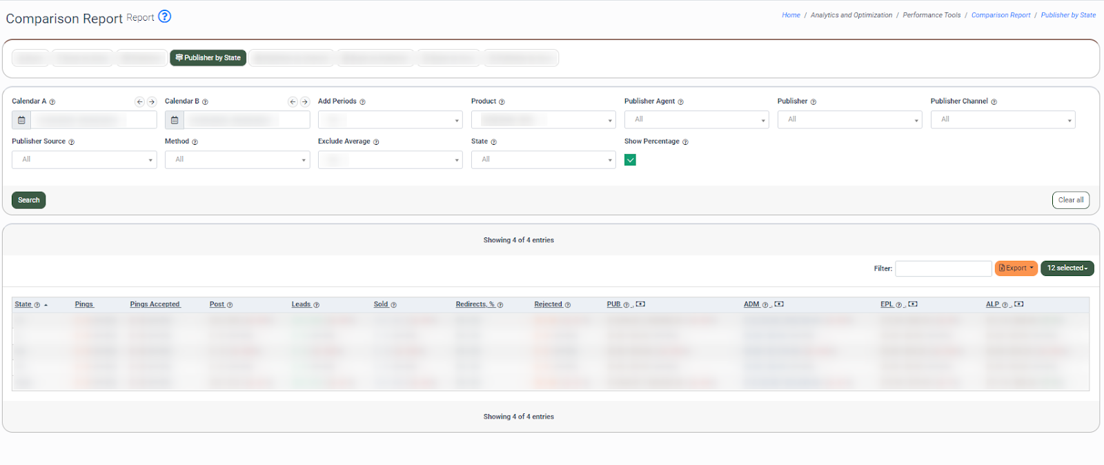The “Publisher by State” tab allows you to view and compare the report of the Publishers’ performance across four different time periods for each state (only in the US). The comparison will display the performance data, including both the numerical figures and the corresponding percentage changes.