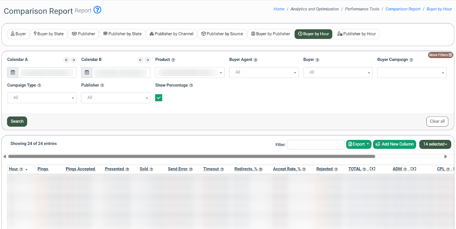 The “Buyer by Hour” tab allows you to view and compare the hourly performance of Buyers across two different time periods. The comparison will display the performance data, including both the numerical figures and the corresponding percentage changes.