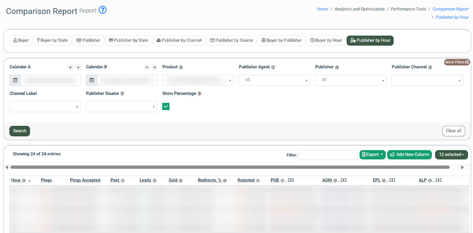 The “Publisher by Hour” tab allows you to view and compare the hourly performance of publishers across two different time periods. The comparison will display the performance data, including both the numerical figures and the corresponding percentage changes.