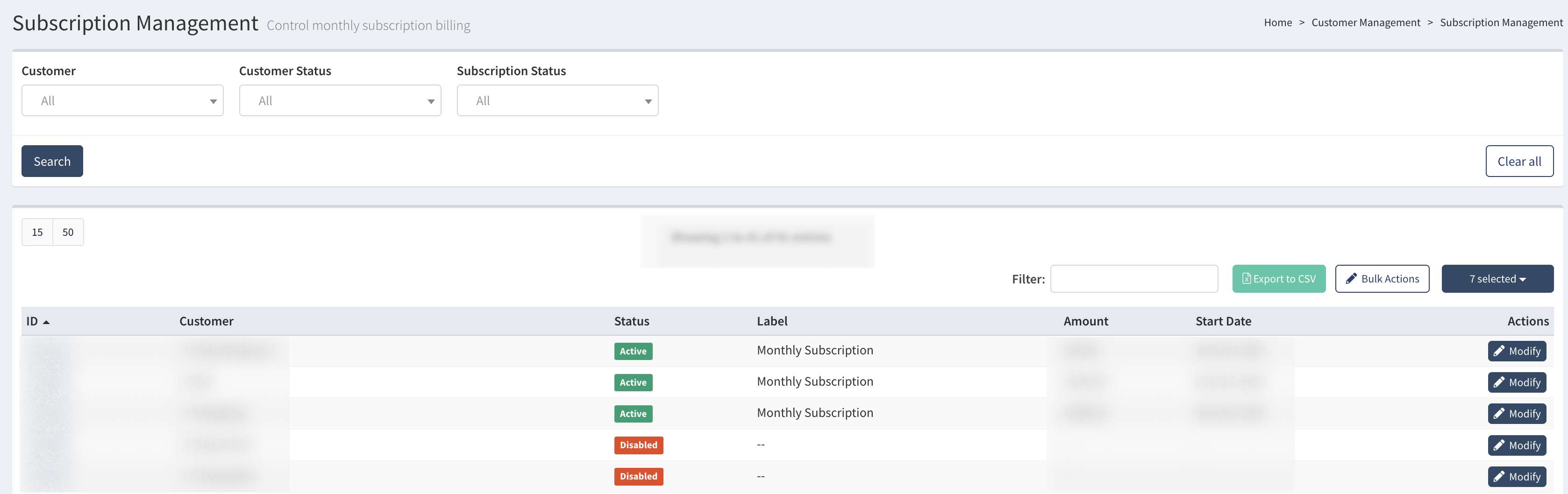 To set a monthly subscription for a Customer, select the Customer from the list and click the “Modify” button in the “Actions” column. Fill in the following information in the pop-up window: