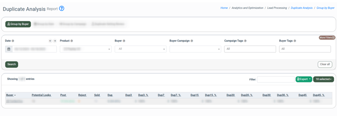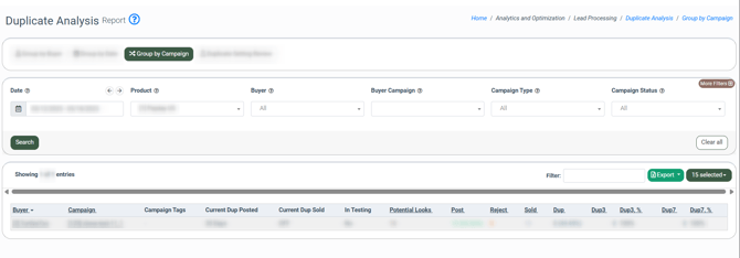 The Duplicate Analysis report provides detailed insights into duplicate leads across campaigns, based on duplicate rules defined on the campaign level. It helps identify leads that were flagged as duplicates based on a defined duplicate method (e.g., email, email + SSN) for sold leads or posts within the selected timeframe, either at the campaign or system level. This information is particularly useful for identifying potential leads overlooked by Buyers and facilitating communication regarding missed opportunities.
