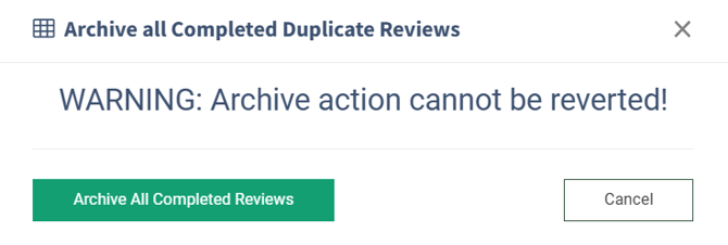 Click the “Archive All Completed Reviews” button in the “Archive all Completed Duplicate Reviews” pop-up window to complete the action.