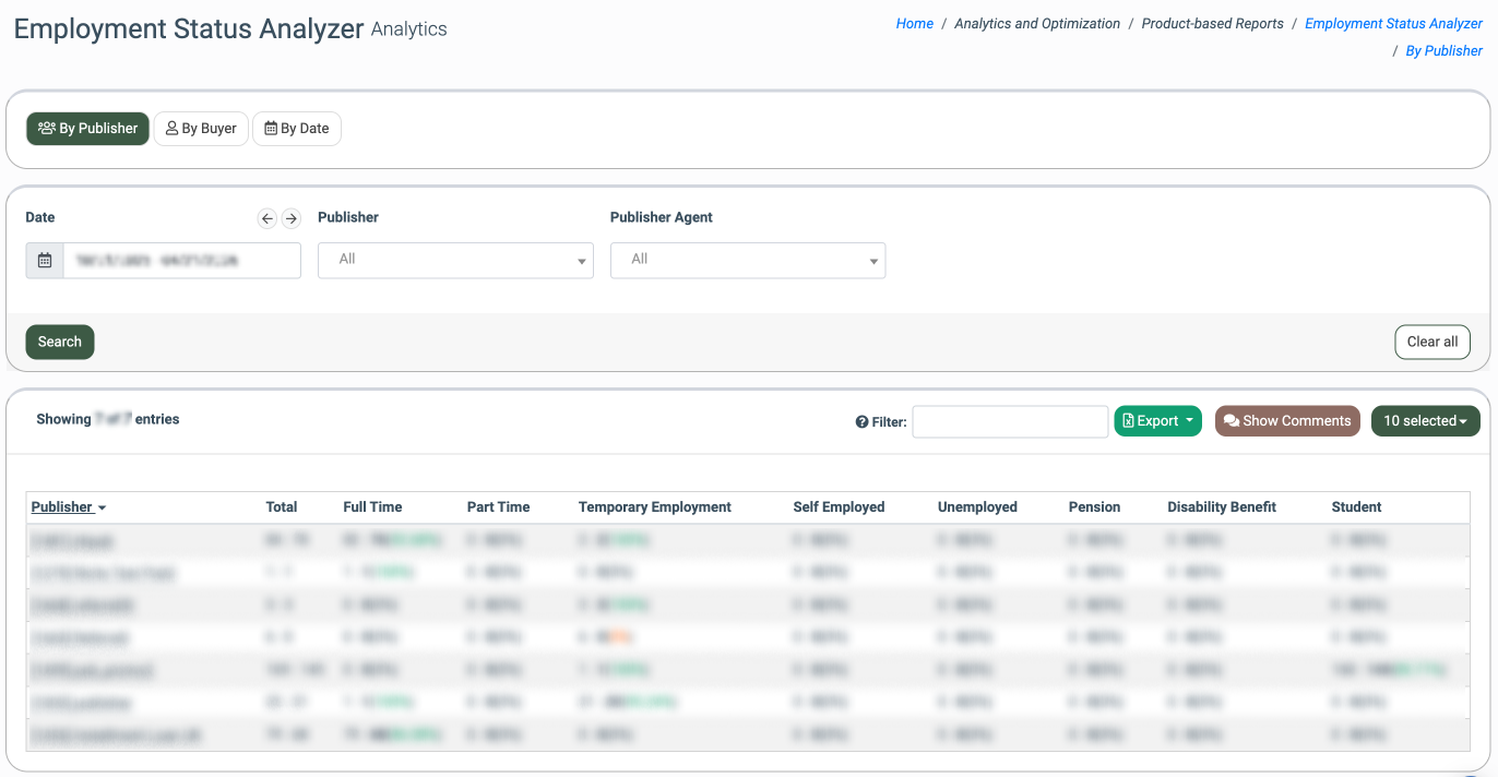 The “By Publisher” tab displays the employment type information on leads from Publishers.