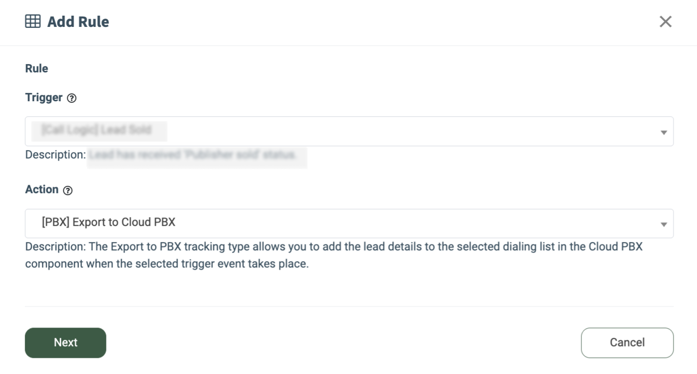 The Export to Cloud PBX tracking type allows you to add the lead details to the selected dialing list in the Cloud PBX component when the selected trigger event takes place.