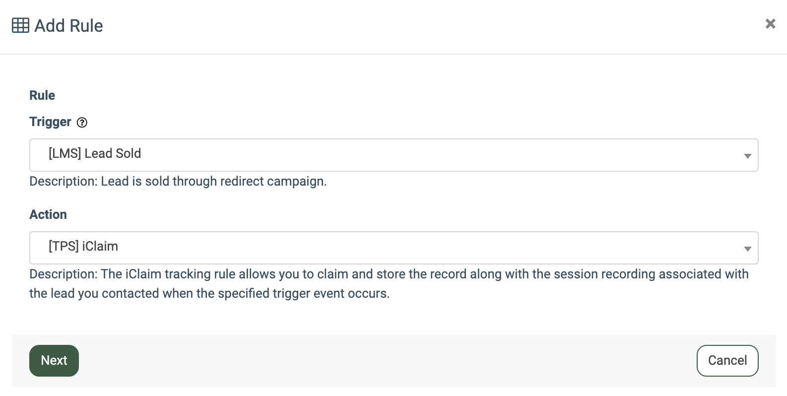The iClaim tracking rule allows you to claim and store the record along with the session recording associated with the lead you contacted when the specified trigger event occurs.