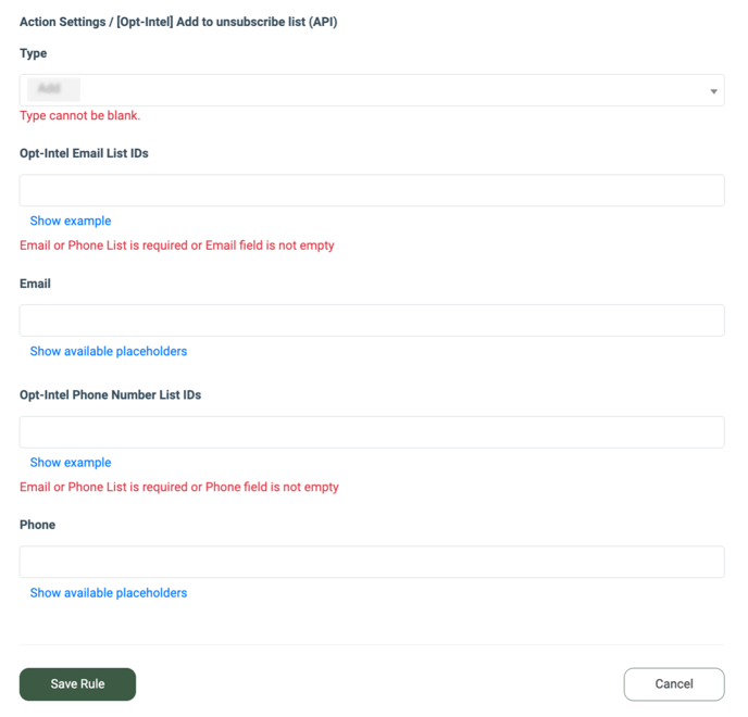 The [Opt-Intel] Add to unsubscribe list (API) tracking type allows you to add/remove an email address and/or phone number to the existing Unsubscribe (Opt-Out) List in Opt-Intel when the selected trigger event takes place.