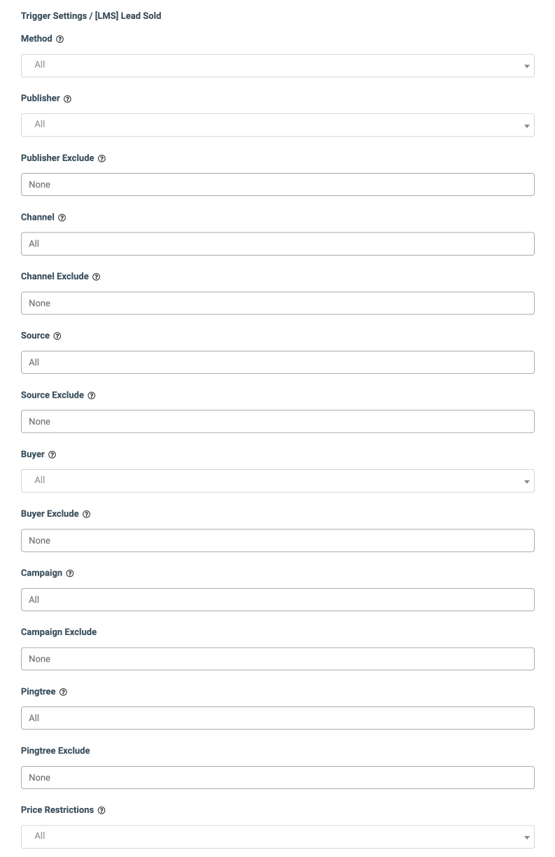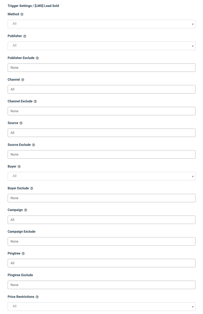 - Price Restrictions: Select the Price restrictions (Price is greater than 0, Price is greater than a certain value, Price is greater than or equal to a certain value, Price is lower than a certain value, Price is lower than or equal to a certain value, Price range inclusive). Note: The “Price range inclusive” value is available only for the “Lead Sold” and “Campaign Sold” triggers.