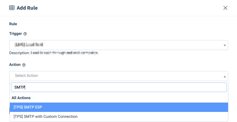 Note: This rule offers two options: “SMTP ESP” to send an email using a predefined ESP connection, and “SMTP with Custom Connection” to send an email via a custom SMTP server when the selected trigger occurs. Choose the option that best fits your business needs.