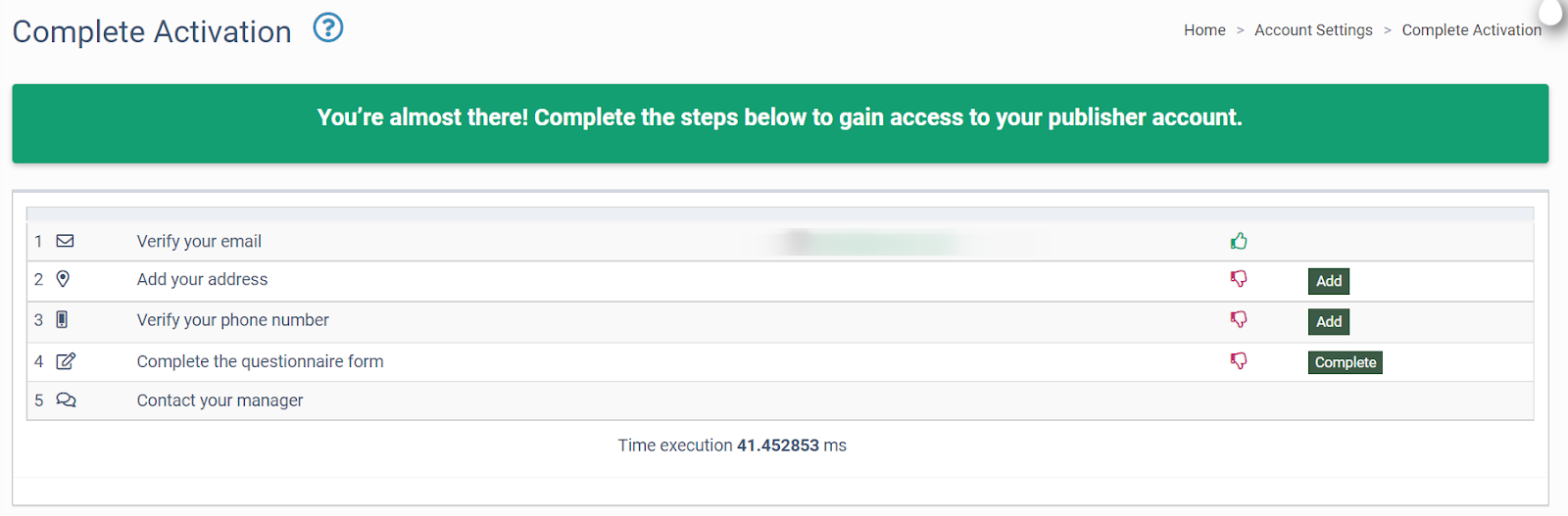 3. When a new client login to the instance, he will be redirected to the “Complete Activation” section. Here the client can see a list of necessary actions in order to complete the registration as a Publisher for himself. Successfully passed steps will be marked with a green thumbs-up symbol, missing steps will be marked with a red thumbs-down symbol. Those steps are the following: