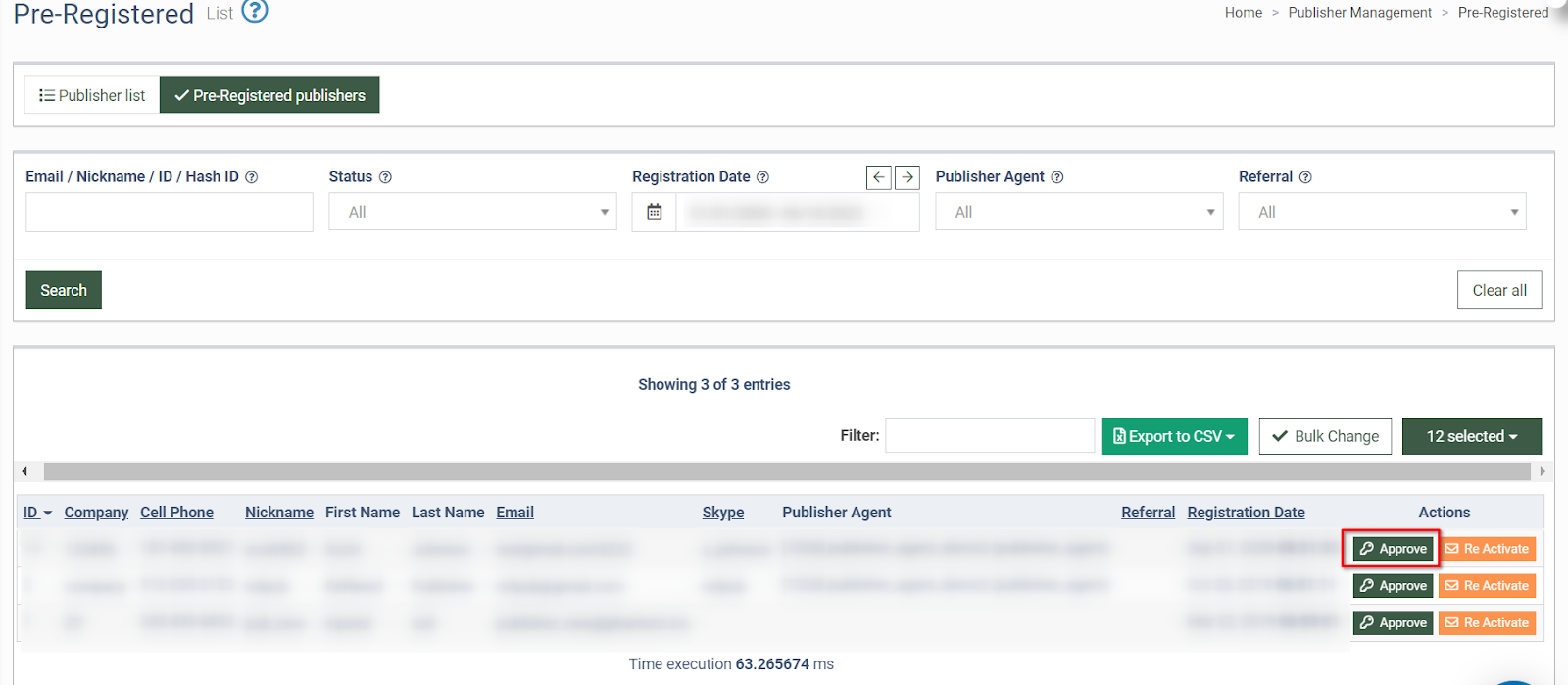 3. A Publisher Agent should go to the Publisher Management > Publishers section. Then open the “Pre-Registered” tab and click the “Approve” button in the “Action” column. In the pop-up window, click the “Approve and Create User” button to complete the action.