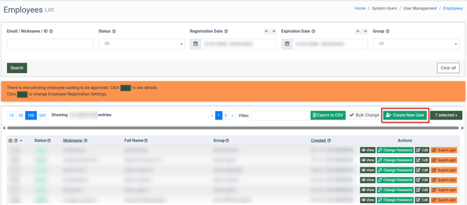 Go to the Global Dashboard > System Users > Employees section and click the “Create New User” button.