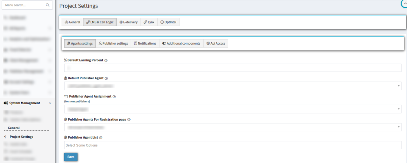 To view and edit publisher agent settings in the system, go to the System Management > General > Project Settings section, select the “LMS and Call Logic” tab, “Agent Settings” subtab.