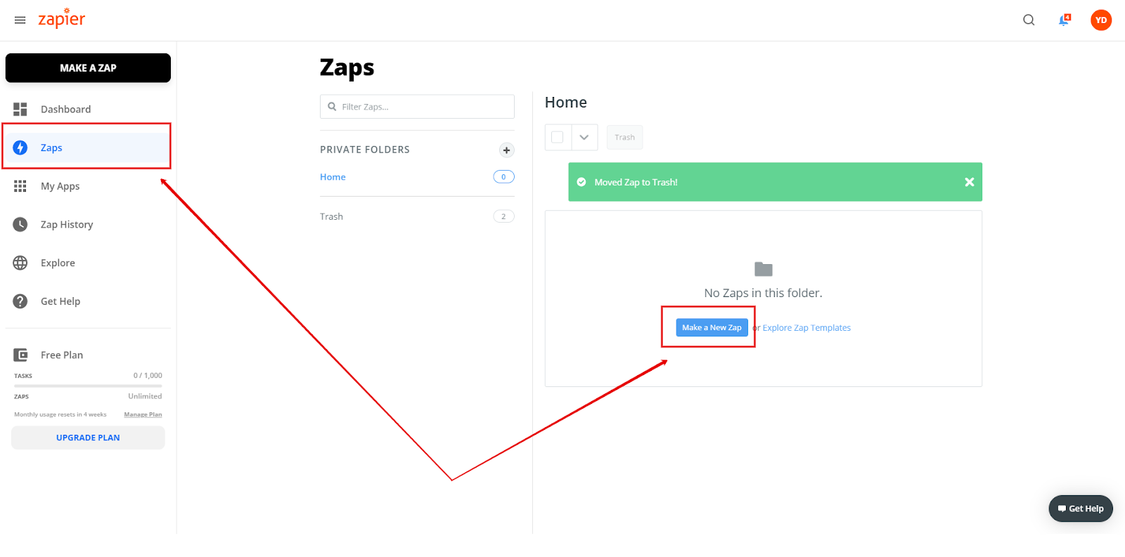 Go to the “Zaps” tab and click the “Make a new Zap” button.