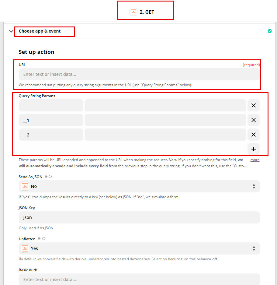 Go to the “Action” section, in the Choose app & Event field select the “Webhooks by Zapier” option, and in the Action Event field select the “Get” option and click the “Continue” button.