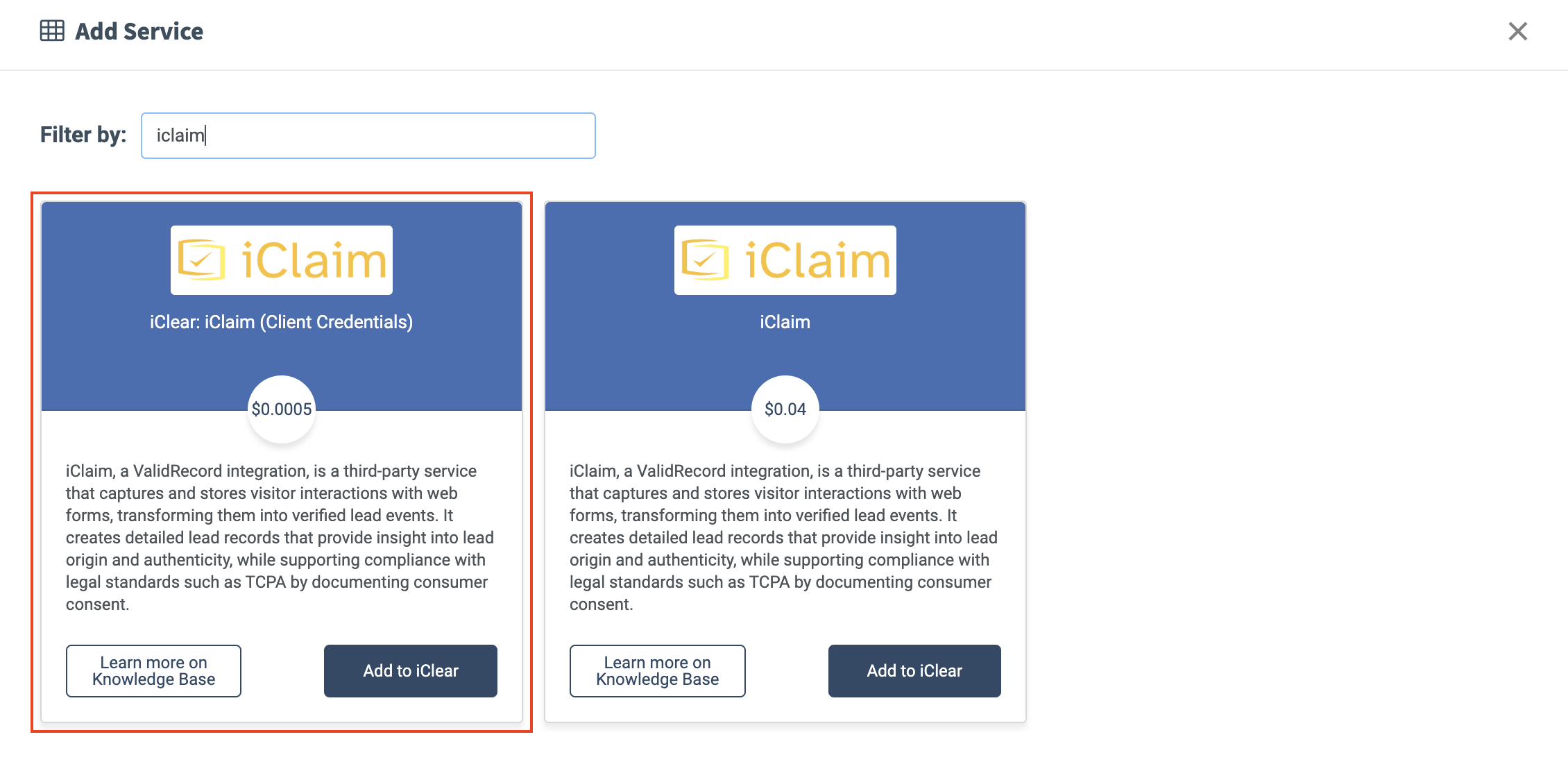 To configure this service, click the “Add Service” button in the Global Rules block. Navigate to the “iClear: iClaim (Client Credentials)” block and click the “Add to iClear” button.