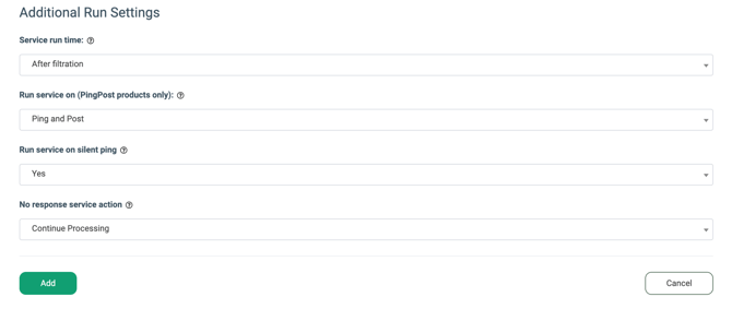Note: Please be aware that selecting this option may impact your invoice. Once this option is selected and no campaigns remain for the service to run, there will be no charges incurred. - Run service on (PingPost products only): Select one of the options to determine at which stage you would prefer to run the service for the Ping Post products (Ping / Post / Ping and Post).