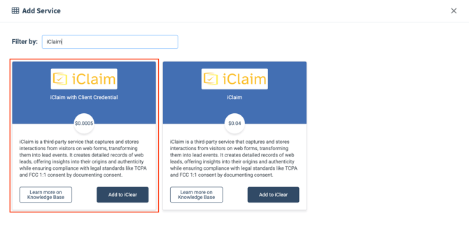 To configure this service, click the “Add Service” button in the Global Rules block. Navigate to the “iClaim with Client Credentials” block and click the “Add to iClear” button.