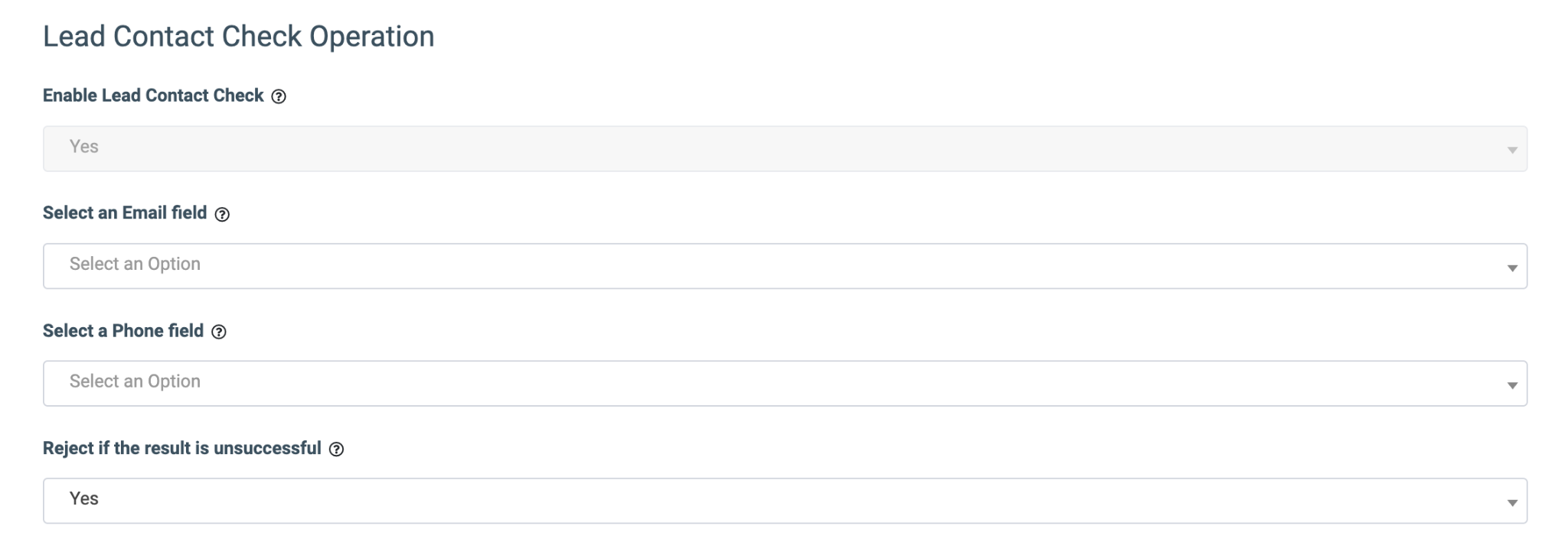 The “Lead Contact Check Operation” allows you to check the lead’s email and/or phone number against the information captured on the lead recording.