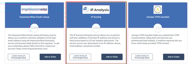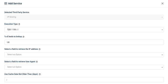 The IP Scoring third-party service allows you to perform real-time validation of the lead IP address and receive a fraud score based on 25 risk analysis data points.