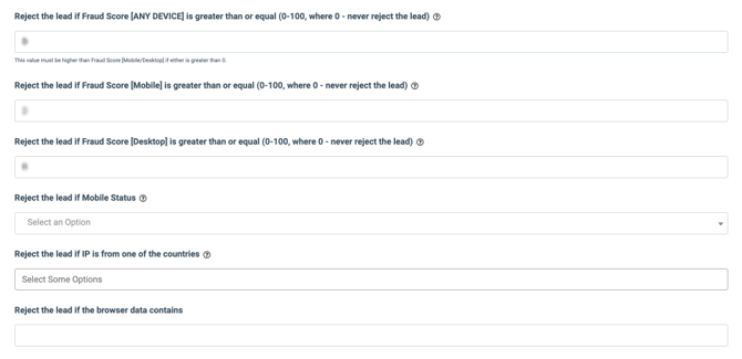 - Reject the lead if Fraud Score [ANY DEVICE] is greater than or equal (0-100, where 0 - never reject the lead): Enter the maximum score value to qualify the lead to be filtered out for all devices that can be used by the user. If a lead's fraud score meets or exceeds this value, it will be filtered out, as it is considered potentially risky or fraudulent. Note: This value must be higher than the Fraud Score [Mobile/Desktop] if either is greater than 0.