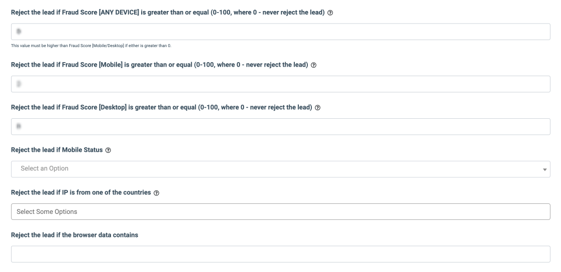 - Reject the lead if Fraud Score [Desktop] is greater than or equal (0-100, where 0 - never reject the lead): Enter the maximum score value at which desktop users should be rejected as leads. If a lead's mobile fraud score meets or exceeds this value, it will be filtered out, as it is considered potentially risky or fraudulent.