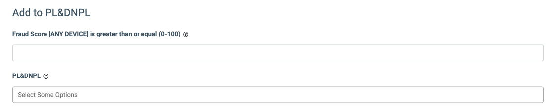 - Fraud Score [ANY DEVICE] is greater than or equal (0-100): Set the maximum lookup score to be added to the chosen PL/DNPLs configuration as an additional filter.
