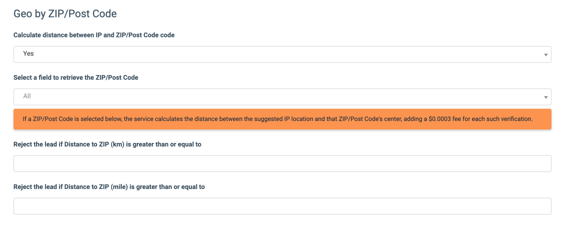 - Reject the lead if Distance to ZIP (km) is greater than or equal to: Enter the maximum allowed distance in kilometers. If the calculated distance between the lead’s IP address and the ZIP/Post Code’s geolocations is greater than or equal to this value, the lead will be rejected.