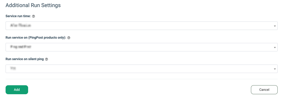 Note: Please be aware that selecting this option may impact your invoice. Once this option is selected and no campaigns remain for the service to run, there will be no charges incurred. - Run service on (PingPost products only): Select one of the options to determine at which stage you would prefer to run the service for the Ping Post products (Ping / Post / Ping and Post).
