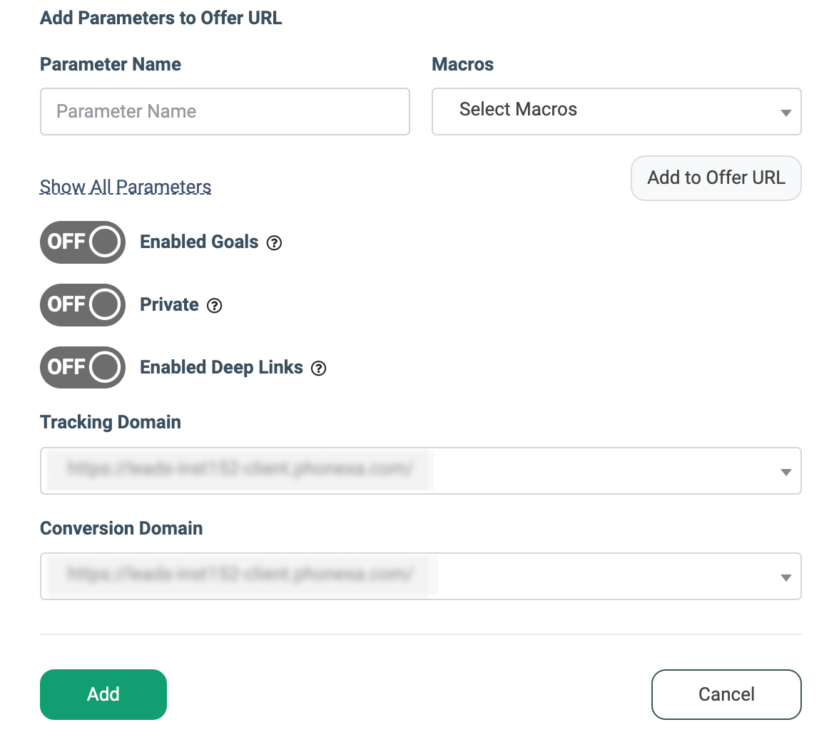 - Add Parameters to Offer URL: Enter the parameters that will be dynamically added to the Offer URL, for example, transaction_id, affiliate_id, or parameters from the Tracking Link. Parameters are only appended to the offer URL if the user opts to display them when landing on the offer page. Fill in the following fields to add a parameter to the Offer URL and click the “Add to Offer URL” button to proceed: