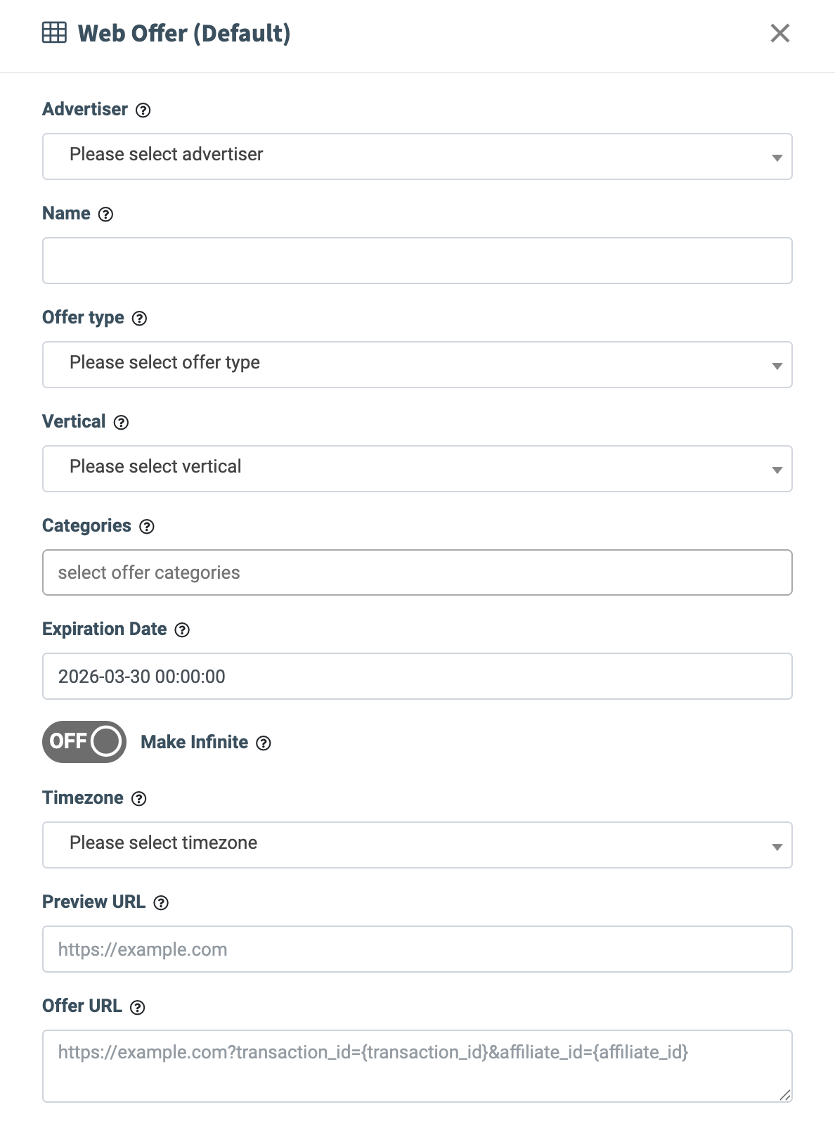 - Offer URL: Enter the offer link for the Advertiser's website, including essential tracking parameters such as a Transaction ID or an Affiliate ID. Offer URL example: https://phonexa.com/?transaction_id={transaction_id}&affiliate_id=[affiliate_id]